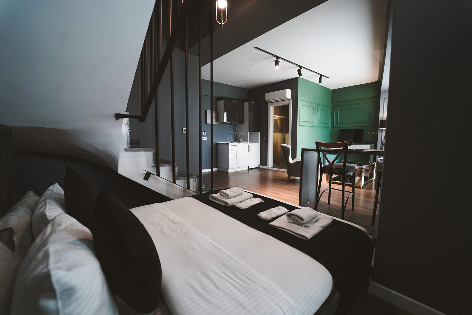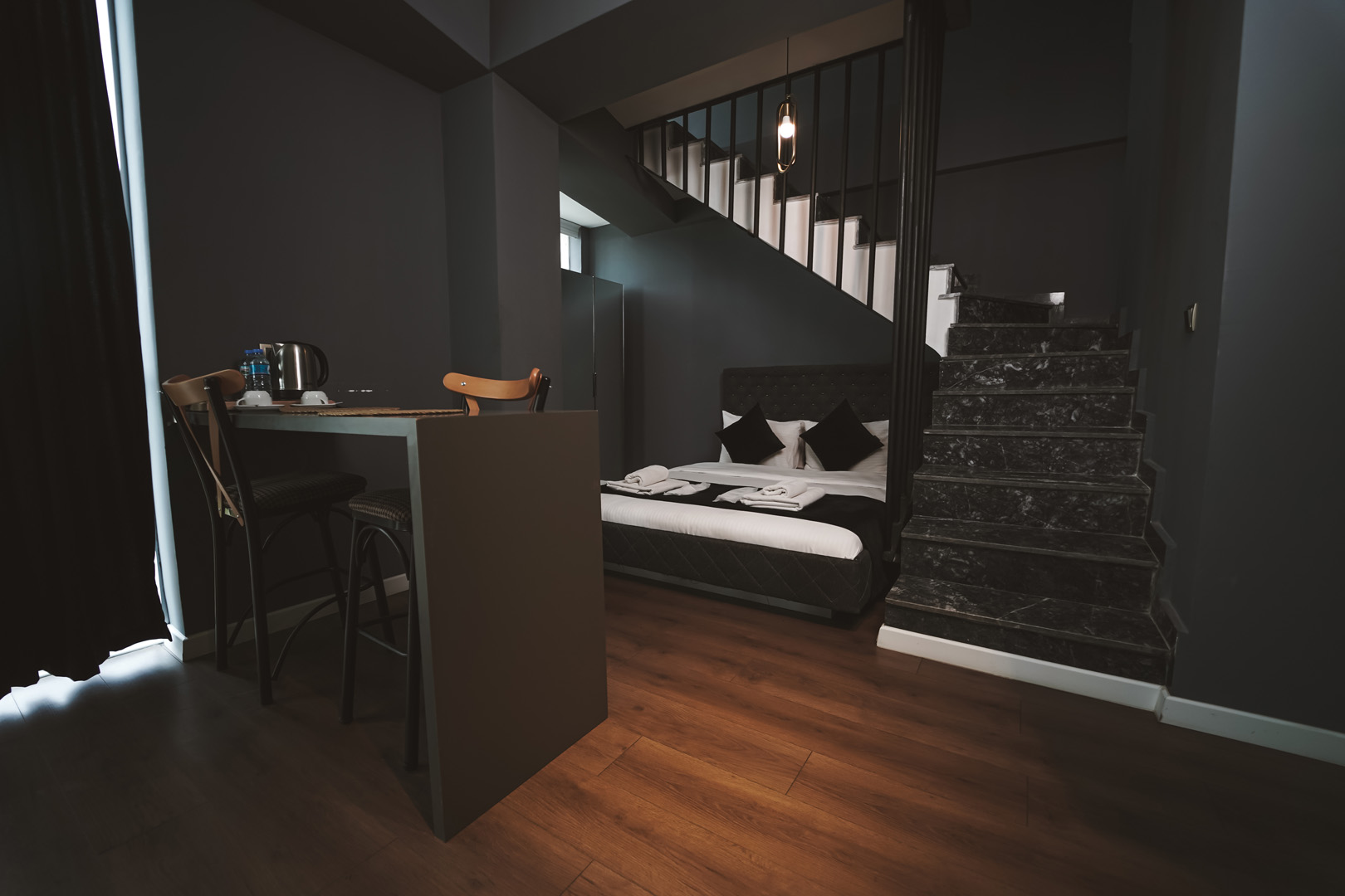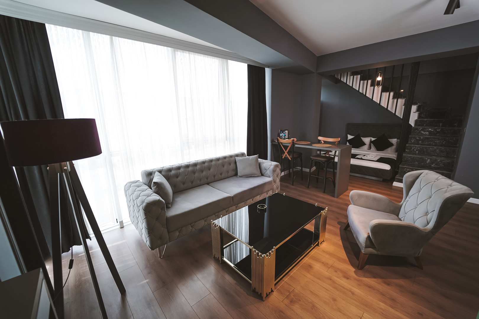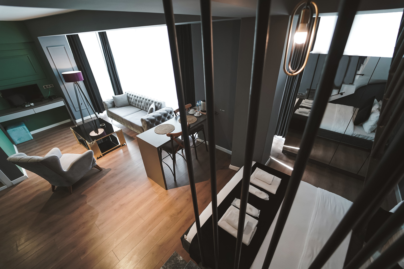 Our rooms with wooden parquet floors feature an extra-long bed, a spacious wardrobe, a comfortable sofa, a dryer, a seating area, and a work desk. Additionally, details such as a vanity table, private entrance, kitchenette, dining area, and dining table bring the comfort of home to our guests.