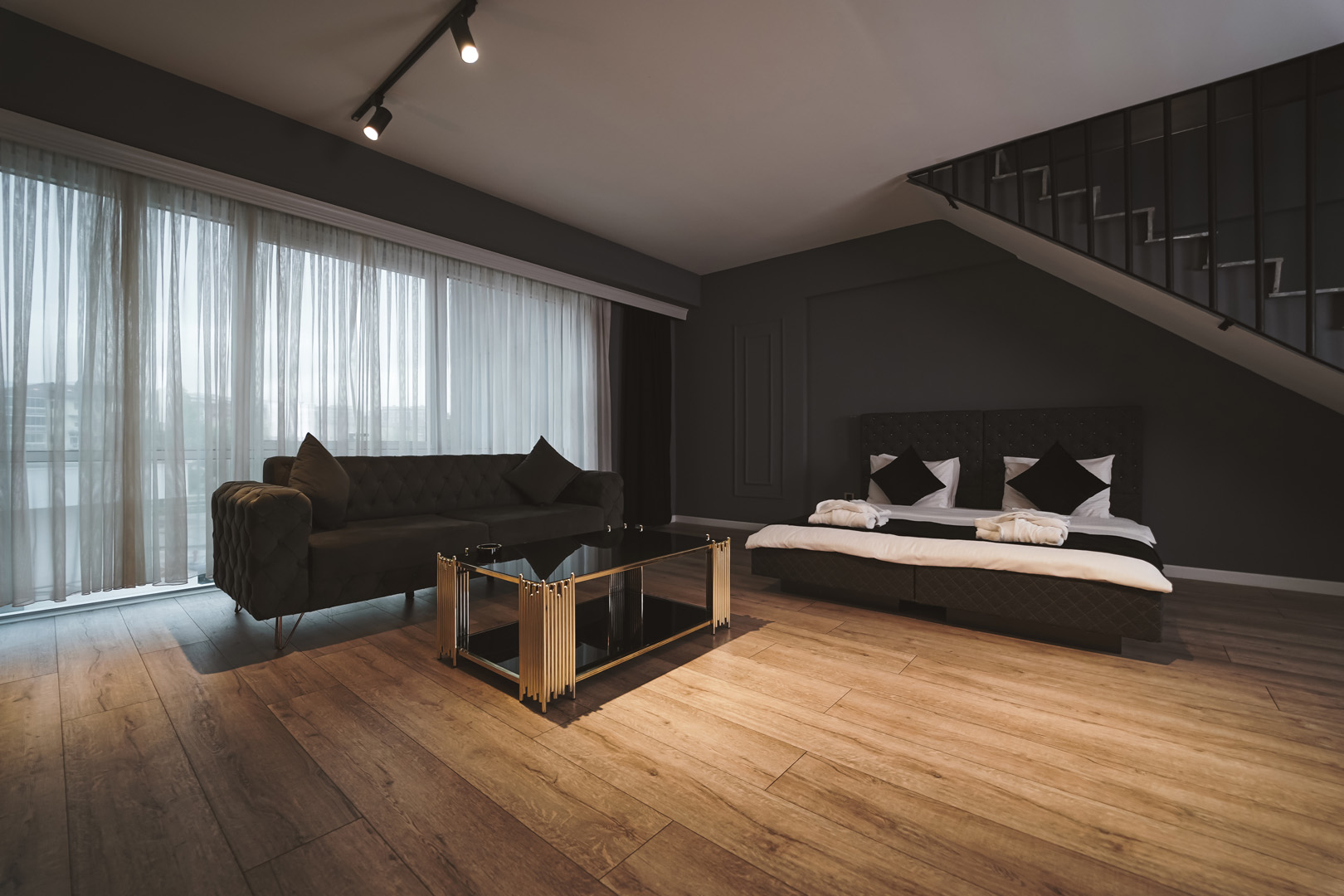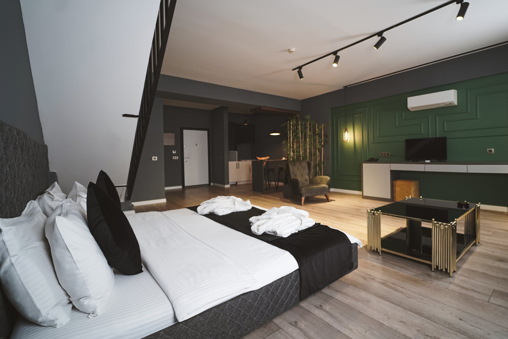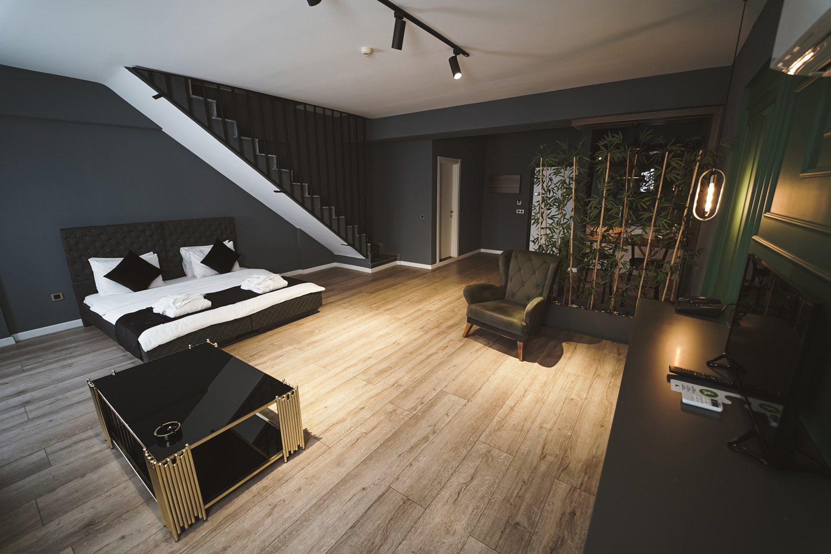 Our rooms with wooden parquet floors feature an extra-long bed, a spacious wardrobe, a comfortable sofa, a dryer, a seating area, and a work desk. Additionally, details such as a vanity table, private entrance, kitchenette, dining area, and dining table bring the comfort of home to our guests.