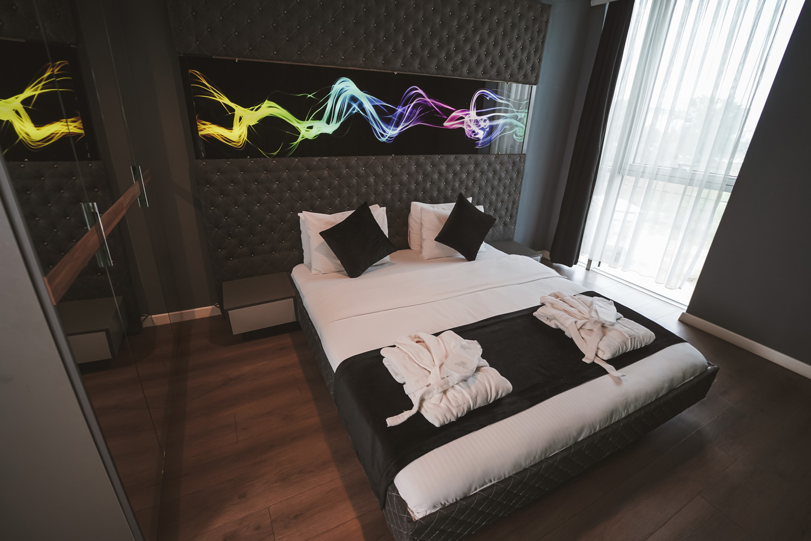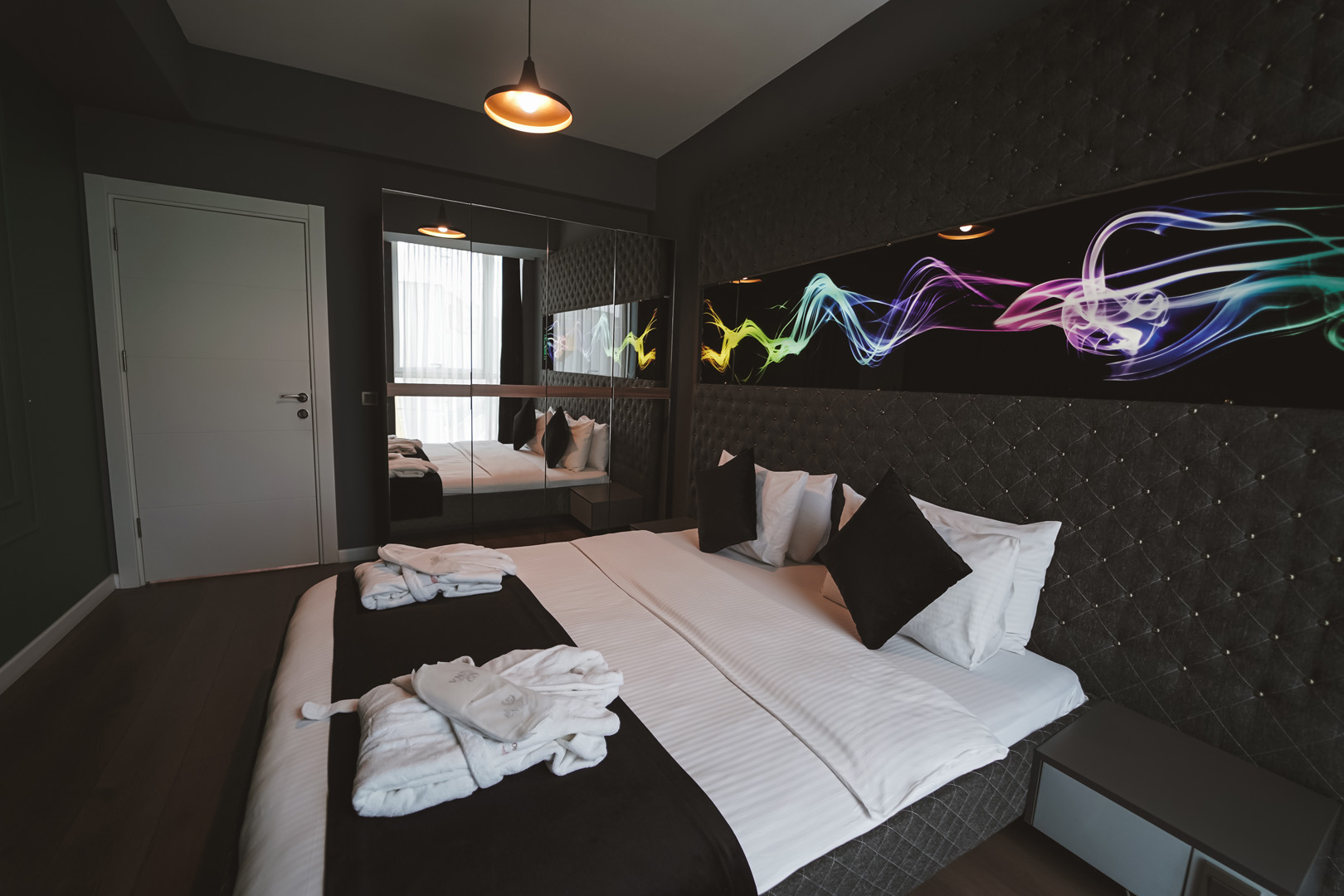 Ahşap parke zemine sahip odalarımızda, ekstra uzun yatak, geniş bir gardırop, konforlu kanepe, kurutucu, oturma grubu ve çalışma masası bulunmaktadır. Ayrıca makyaj masası, özel giriş, mini mutfak, yemek alanı ve yemek masası gibi detaylarla konuklarımıza ev konforunu yaşatıyoruz.